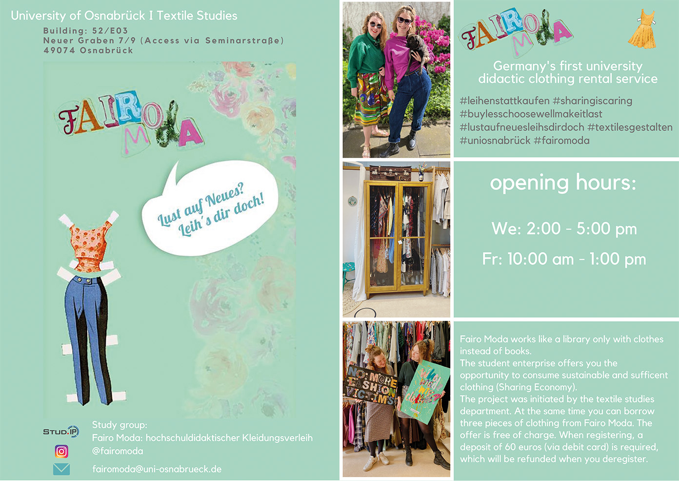 The time has finally come: Fairo Moda will open its doors on June 1, 2021. The university-internal and university didactic clothing rental service is located on the city center campus in building 52/E03 with access opposite Seminarstraße 33 in Osnabrück. The principle works like a library with clothes instead of books. Fairo Moda wants to act according to the motto of the sharing economy (like the car-sharing principle) and offer an opportunity for shared clothing consumption. The project was initiated by the Department of Textile Studies. In its academic theory, the course deals intensively with vestimentary sustainability and now also offers a practical opportunity for students and employees of Osnabrück University in the form of a clothing rental service. three items of clothing can be borrowed at the same time. The offer is free of charge. A deposit of 60 euros is required when registering, which will be refunded when you check out. The money or part of the money will be retained if the borrowed textiles are lost or damaged. Due to the current situation, there will be a soft opening on June 1, 2021. A small opening ceremony has been postponed but not canceled. It will take place once the coronavirus situation has eased and gatherings are possible again.
