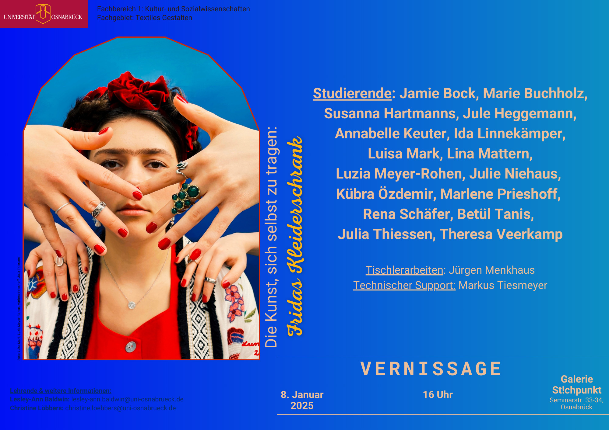 Frida Kahlo is considered one of the most important artists of the 20th century. She exemplifies the combination of personal experience, political stance and aesthetic expression. Her works, her biography and her extraordinary style of dress make her an outstanding figure of cultural identity and artistic self-presentation. This complexity opens up a variety of approaches, particularly in the field of design education. In this context, a two-semester project seminar was held in Textile Design as part of the module Research and Presentation in Academic Contexts. The module focused on the examination of Frida Kahlo with regard to her fashionable self-presentation, combined with scientific research, textile design work and the conception of an exhibition. Over the course of the two seminars, the students developed an exhibition entitled "The Art of Wearing Yourself: Frida's Wardrobe" under the direction of Lesley-Ann Baldwin and Christine Löbbers.
